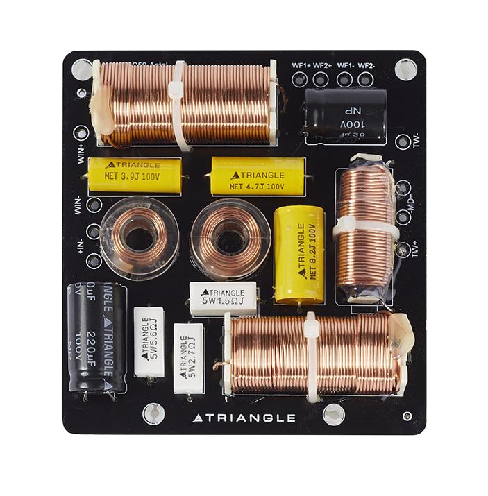 Wszystkie komponenty wykorzystane do budowy zwrotnicy zostały skompletowane pod kątem zachowania najwyższej jakości. Dlatego zwrotnice kolumn serii ESPRIT wyposażone są w miedziane cewki o średnicy 1mm oraz kondensatory MET (Metallized Polyester Film).